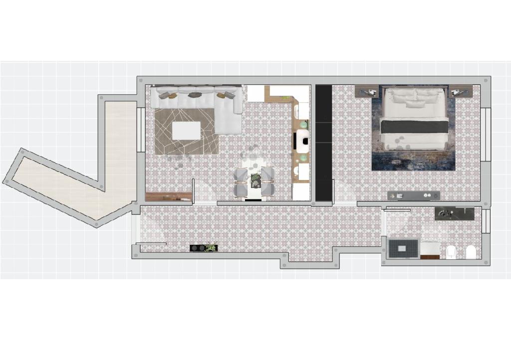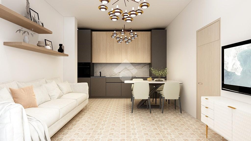 La zona giorno, dalla metratura confortevole, è composta da un ampio open-space con cucina a vista, ed è resa luminosa grazie alla presenza di una portafinestra con accesso al balcone.