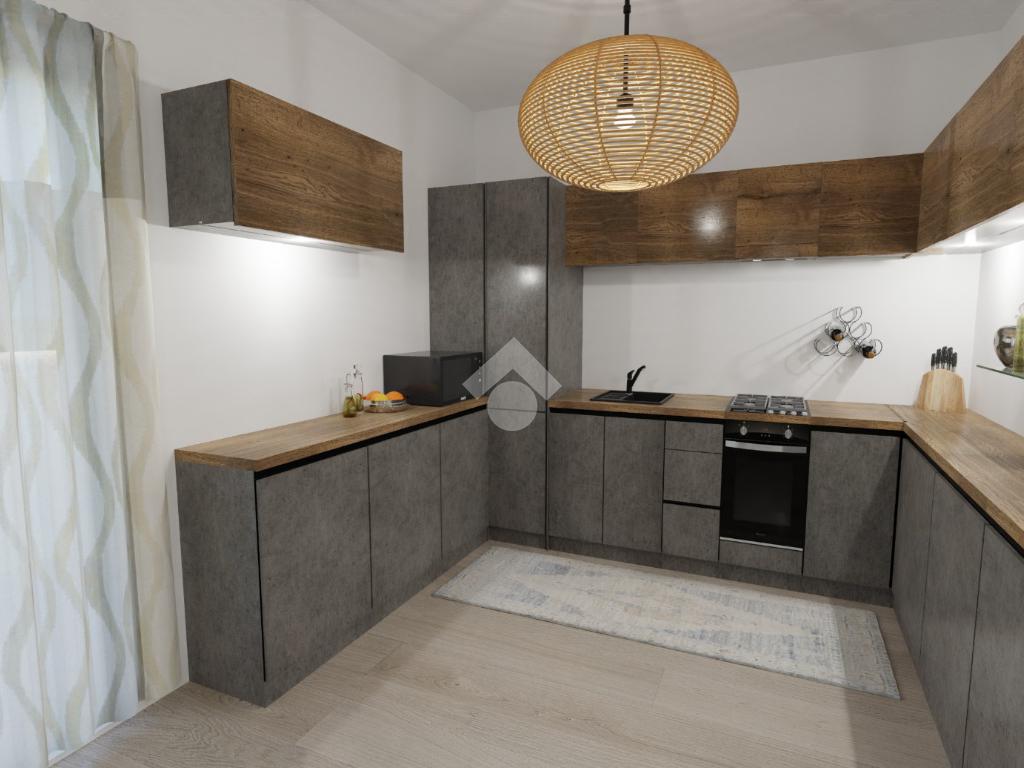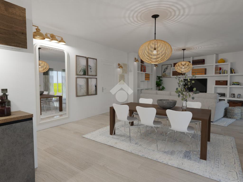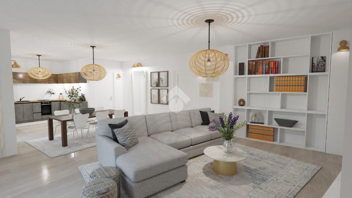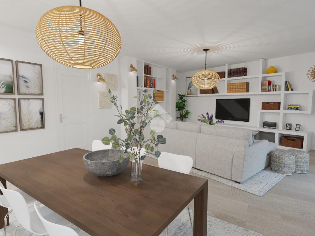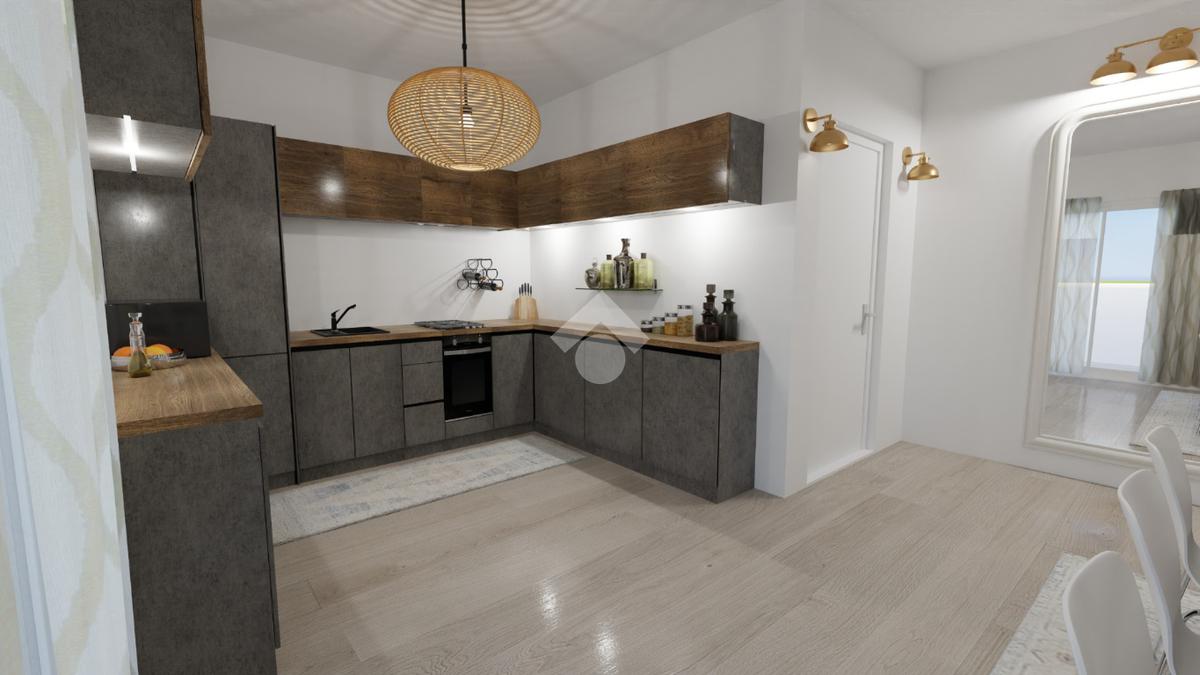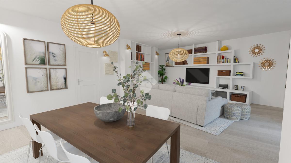 L’ingresso conduce direttamente nella spaziosa zona giorno, divisa in zona living e zona pranzo; la cucina è a vista sul soggiorno ed i locali sono resi luminosi grazie alla finestra ed alle due porte-finestra dalle quali si accede al balcone loggiato.