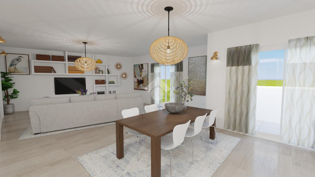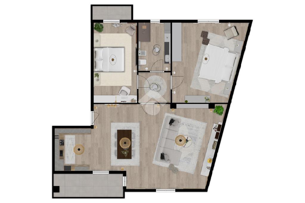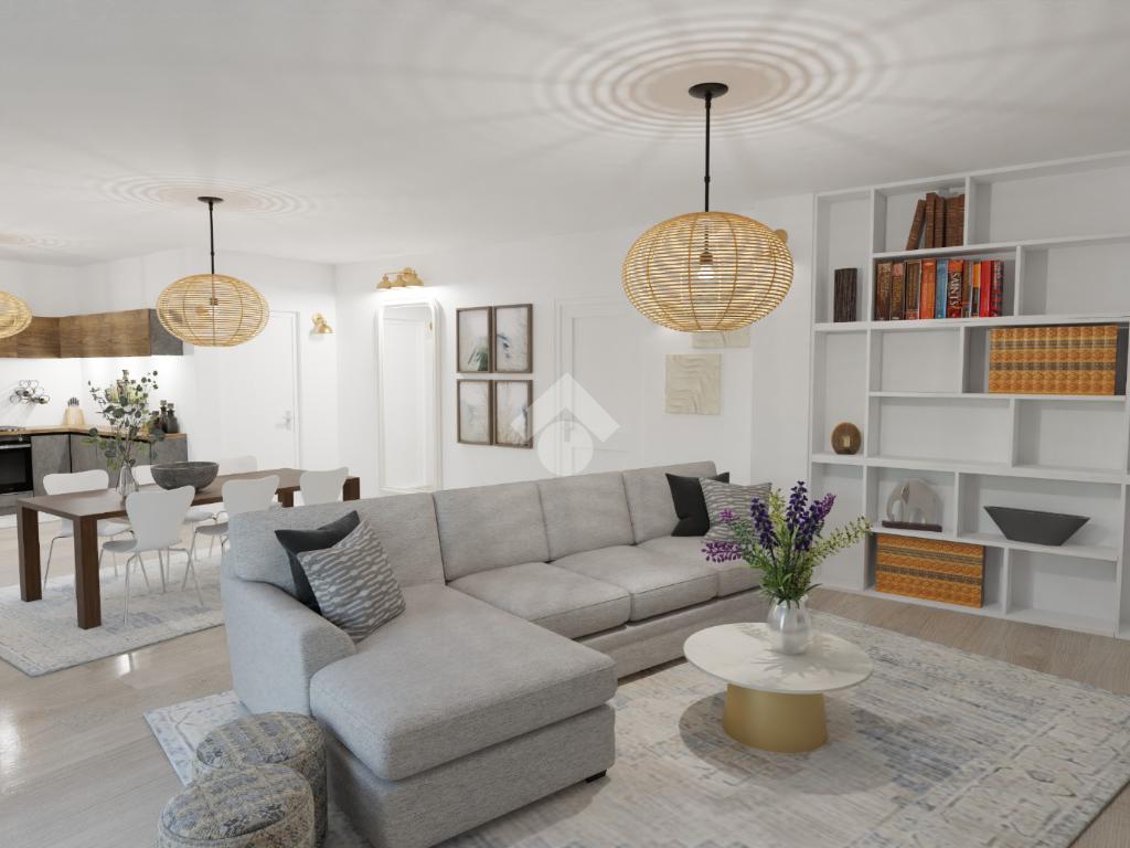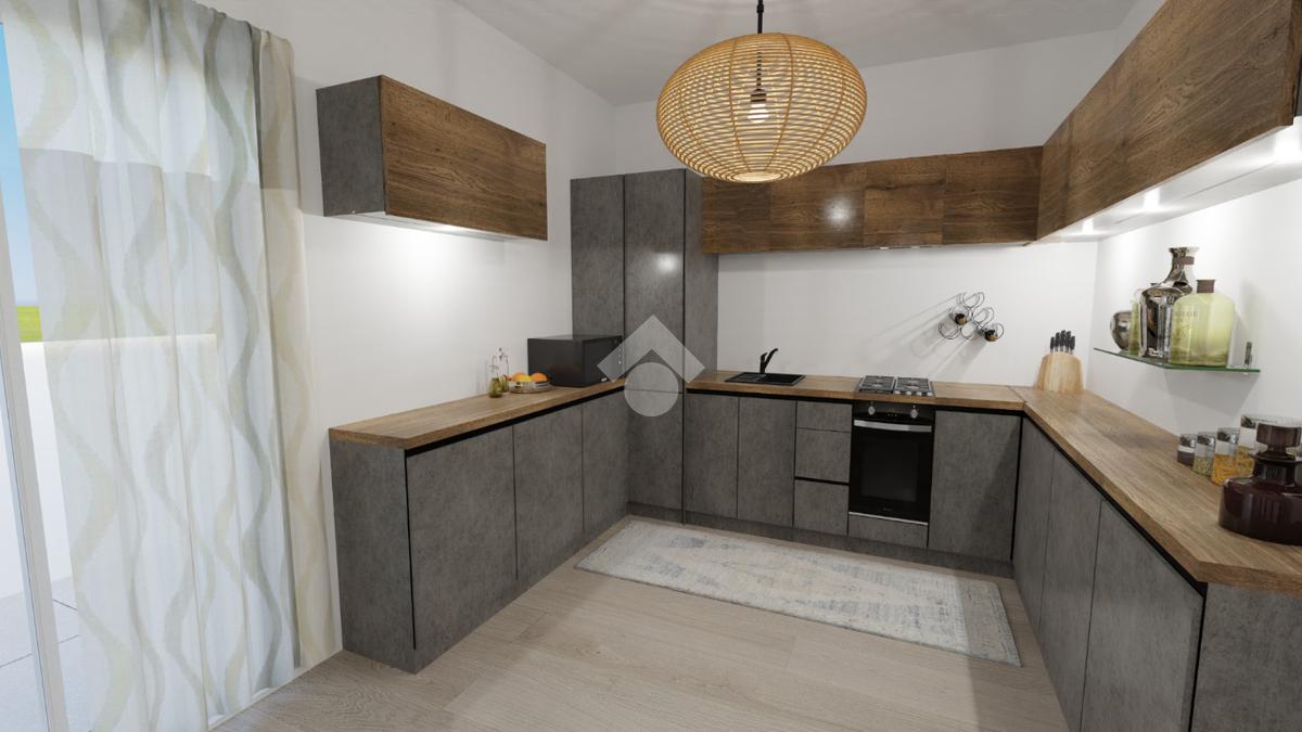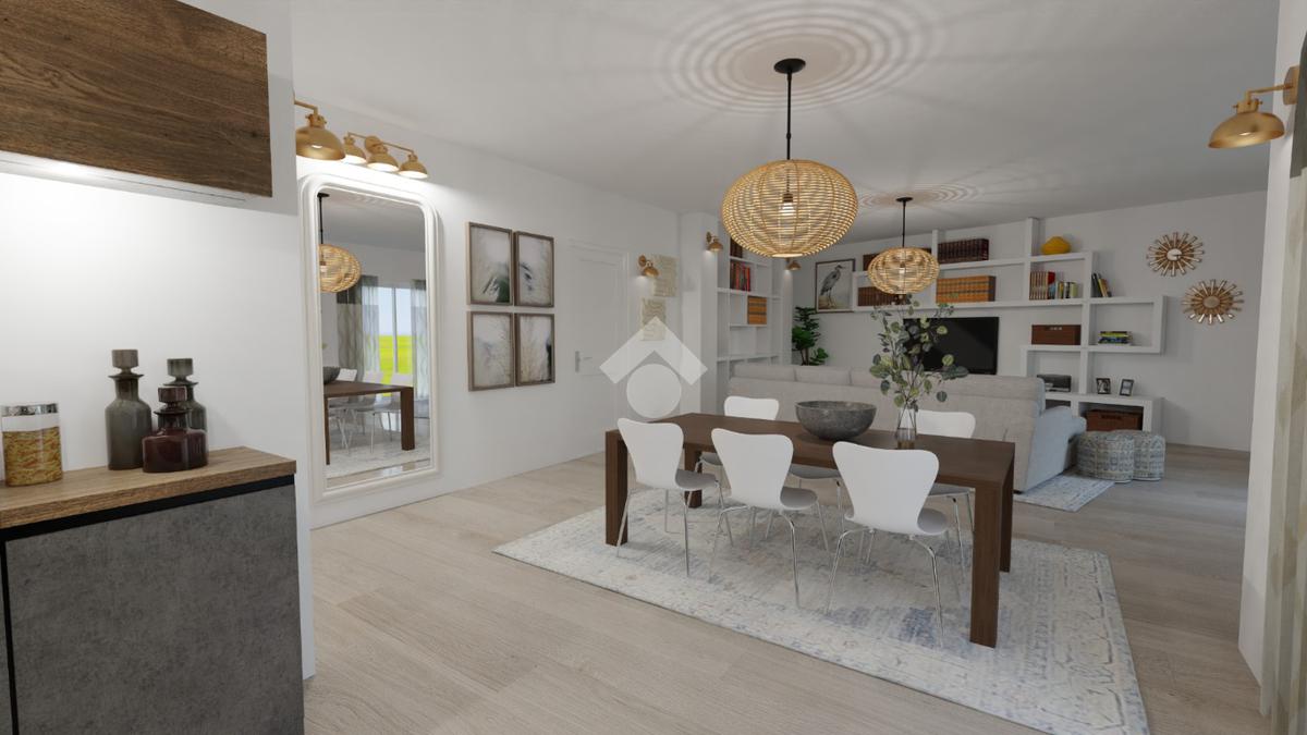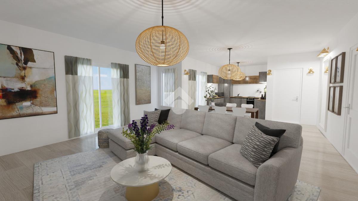 L’ingresso conduce direttamente nella spaziosa zona giorno, divisa in zona living e zona pranzo; la cucina è a vista sul soggiorno ed i locali sono resi luminosi grazie alla finestra ed alle due porte-finestra dalle quali si accede al balcone loggiato.