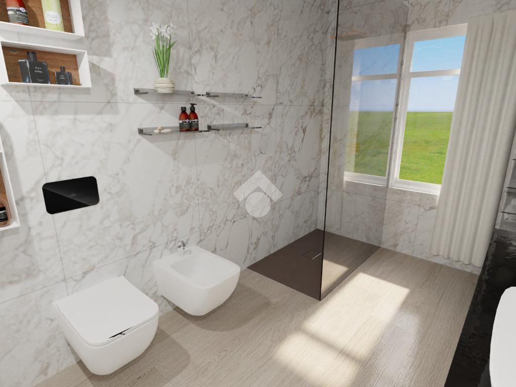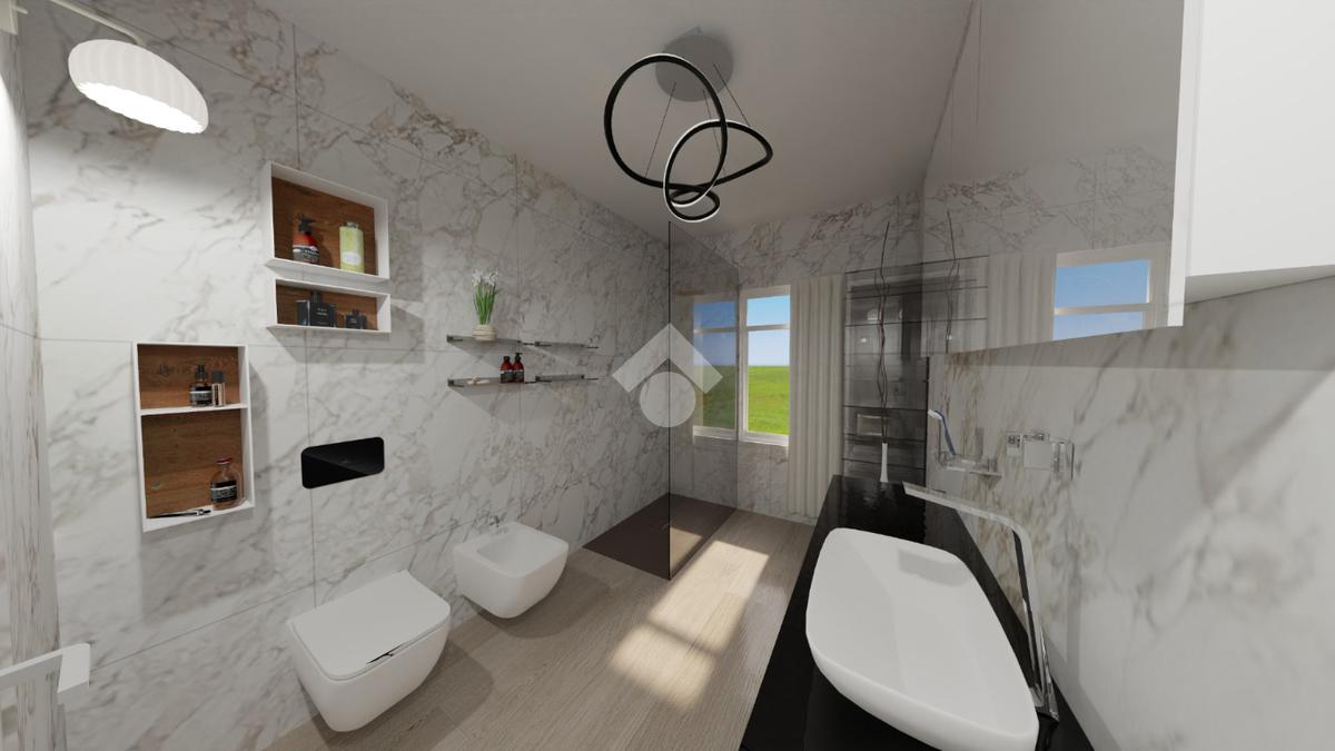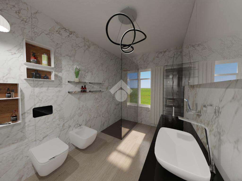 Il bagno finestrato è completo di sanitari, doccia ed attacchi della lavatrice.