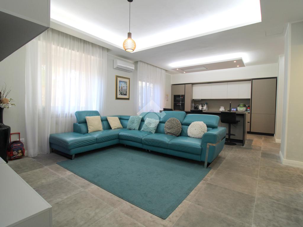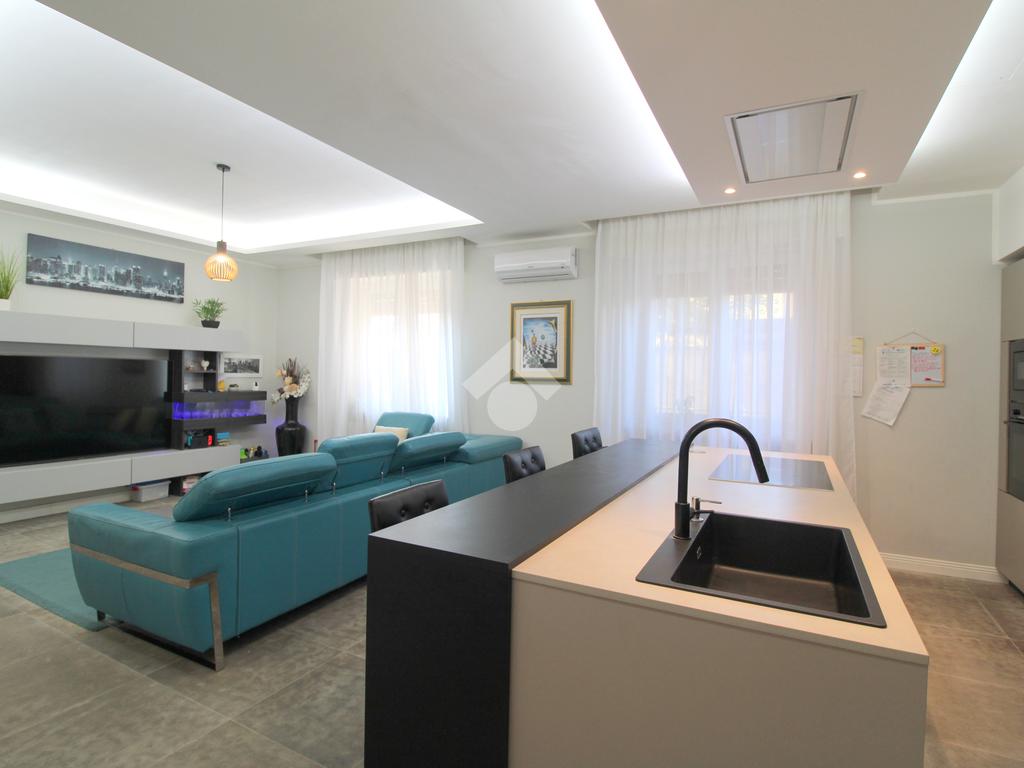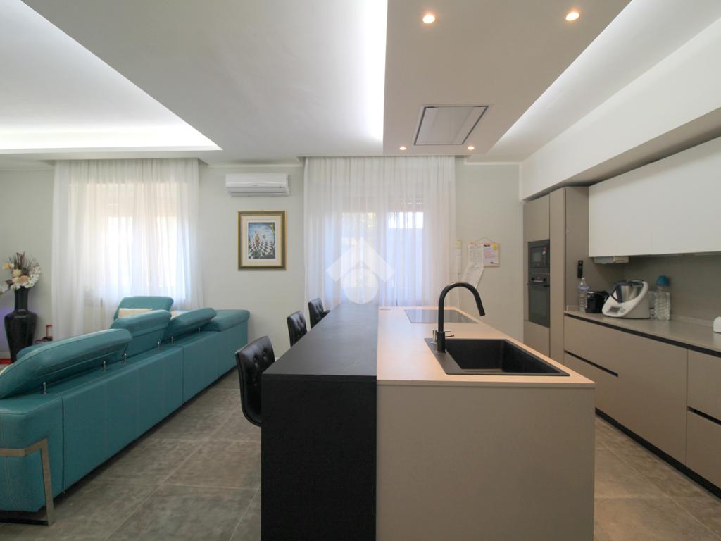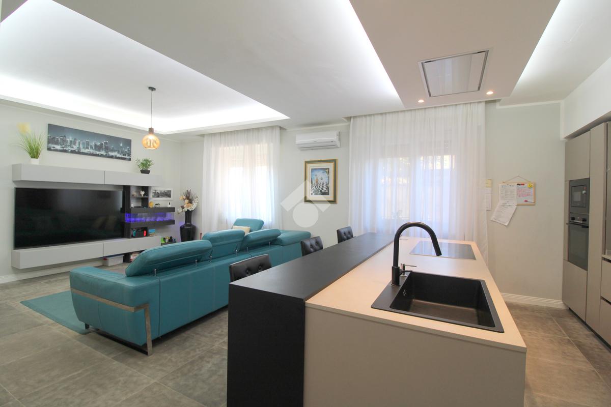 La zona giorno è composta da una importante zona living open space con cucina di oltre 60 mq! Troviamo quindi una zona relax, una moderna cucina completa di isola e piano ad induzione ed una zona pranzo con porta finestra che permette l'uscita in giardino. A concludere il bagno finestrato con doccia.