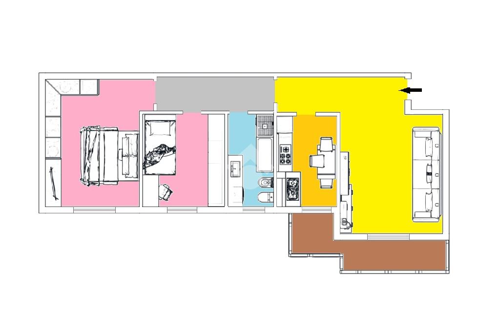 L'ingresso ci porta direttamente nella zona giorno; un'ampia zona leaving con balcone di pertinenza.