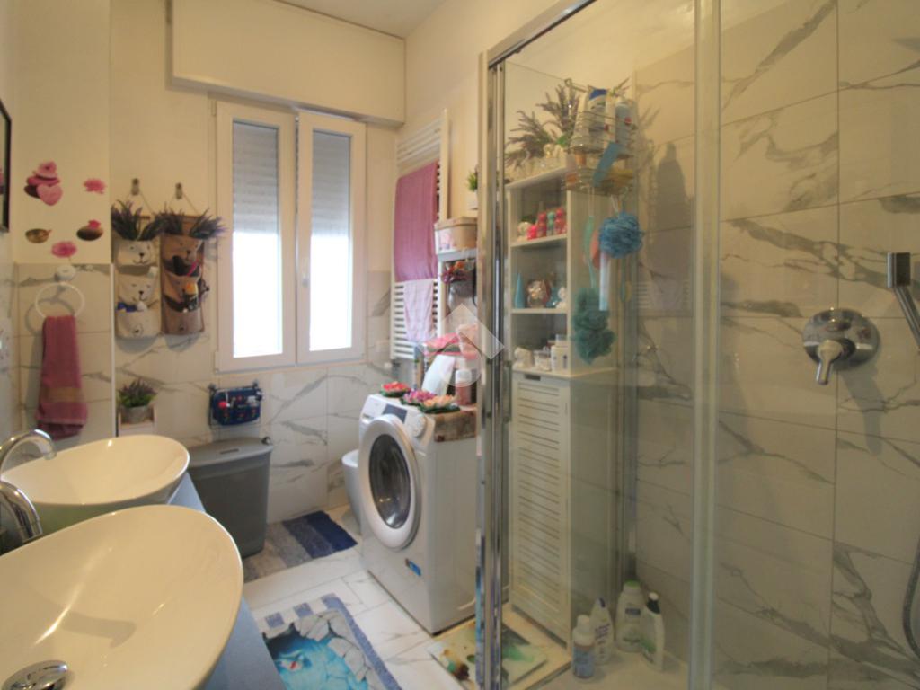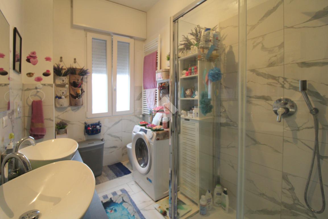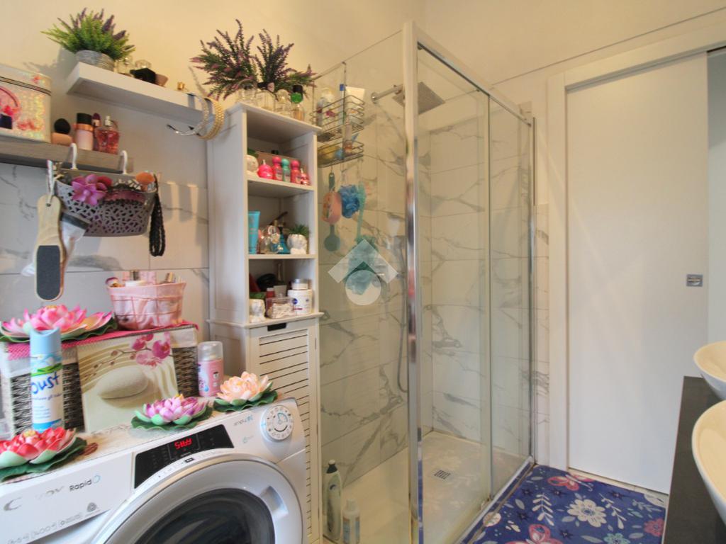 Il bagno finestrato è dotato di doccia e degli attacchi della lavatrice.